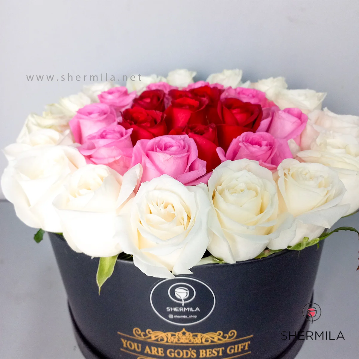 باکس گل آیدا : این باکس گل زیبا که در تصویر می بینید، در سایت شرمیلا قابل سفارش است. این باکس شامل 30 شاخه رز در رنگ های سفید ، قرمز و لب صورتی می باشد که تمام آن ها از گلخانه ی شرمیلا می آیند و دارای اصالت و سلامت فیزیکی هستند و در یک باکس مشکی بسیار شیک قرار گرفته اند و تا مدتی طولانی سالم و شاداب کنارتان میمانند و فضای اطرافتان را عطرآگین میکنند .