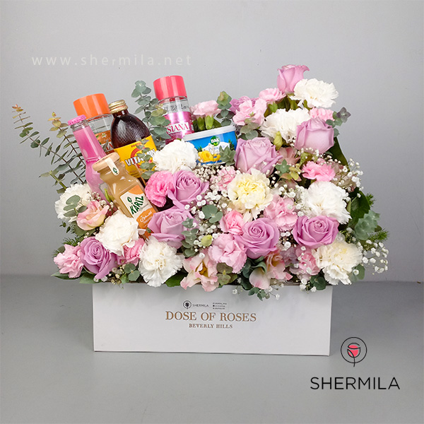 برای حفظ تازگی گلها، باکس را در مکانی خنک و دور از نور مستقیم خورشید قرار دهید. در صورت امکان، آب را به ساقههای گلها اضافه کنید و هر چند روز یک بار آب را تعویض کنید.