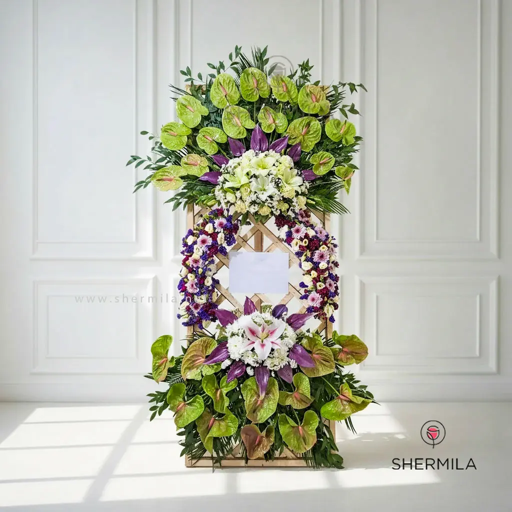 این تاج گل زیبا از گل هایی مانند : آنتوریوم سبز، بنفش ، لیلیوم کرم ، لیسینتوس کرم، داوودی سفید، زنبوری سفید و … تشکیل شده است. این تاج گل را می توان برای مراسماتی مانند ترجیم و تبریک و یا ارسال به نمایشگاه ومسجد استفاده کرد.