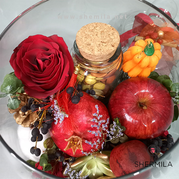 - توجه : به همراه 1 عدد میوه سیب، یک عدد میوه انار، یک شیشه آجیل تازه، فال ورقی، شمع فانتزی کدویی