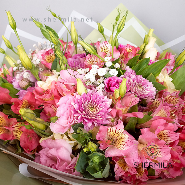 مشخصات دسته گل زُمزد: امروز با یک دسته گل بسیار زیبا در خدمت شما هستیم.این دسته گل را می توانید با کد در سایت شرمیلا خریداری نمایید. این دسته گل شامل 2 داوودی صورتی ، 2 لیسنتوس سفید، 2 لیسنتوس صورتی،2 آلسترومریا صورتی و 2 میخک بنفش به همراه تزئینات سایت شرمیلا می باشد.