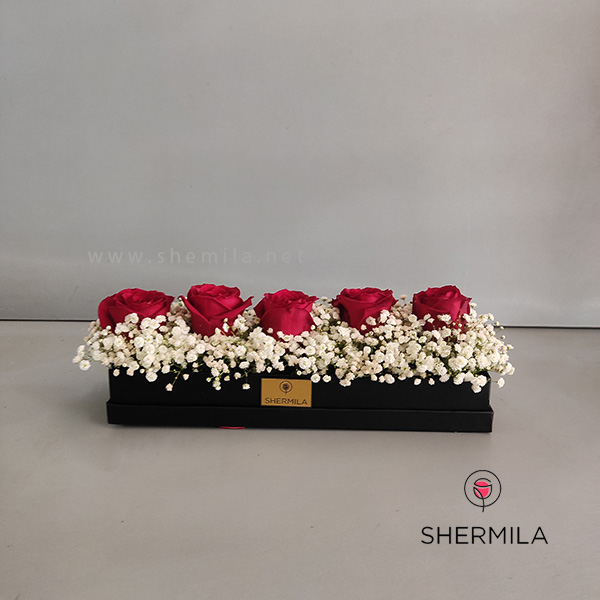 این باکس گل 5 شاخه گل رز هلندی به همراه تزئینات لازم می باشد.