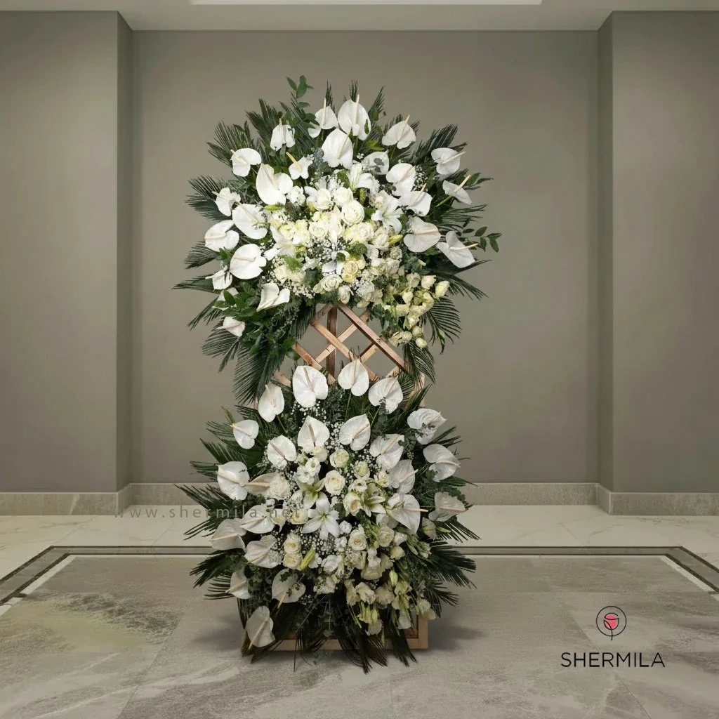تاج گل ترحیم کاویان، نمادی فاخر از احترام و همدردی برای مراسم یادبود شماست. این تاج گل شیک با ترکیبی هنرمندانه از گلایل سفید، ژربرا و داوودی کرم دیزاین شده تا نهایت وقار را به مراسم شما ببخشد. طراحی متوازن و استفاده از گلهای تازه، تضمینکننده زیبایی ماندگار این محصول است. با سفارش تاج گل کاویان، از ارسال سریع و تضمین تازگی گلها بهرهمند شوید و پیام تسلیت خود را با شکوه ابراز کنید.