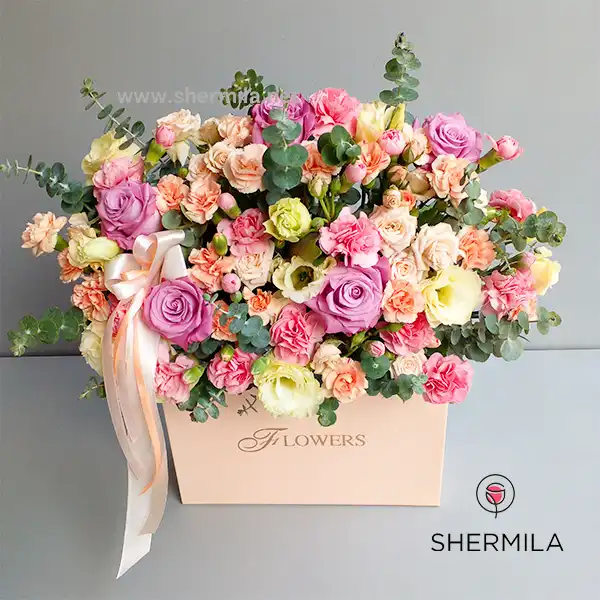 باکس گل لاوان: این محصول از گلهای رز، میخک و لیسینتوس متشکل شده که به همراه باکس صورتی رنگ توسط گل آراهای هنرمند شرمیلا به بهترین شکل تزیین شده و فضای چشمگیری خلق نموده است.