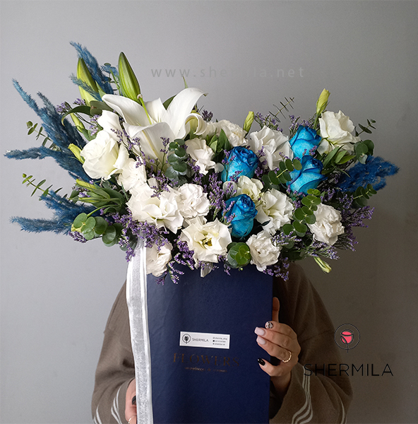 باکس گل نیاز از گلهای : لیلیوم، میخک سفید جذاب و رزهای آبی به همراه گل های ریز افشان و پامپاس های زیبا تهیه شده که در باکس سورمه ای رنگ زیبا در کنار یکدیگر قرار گرفته اند.