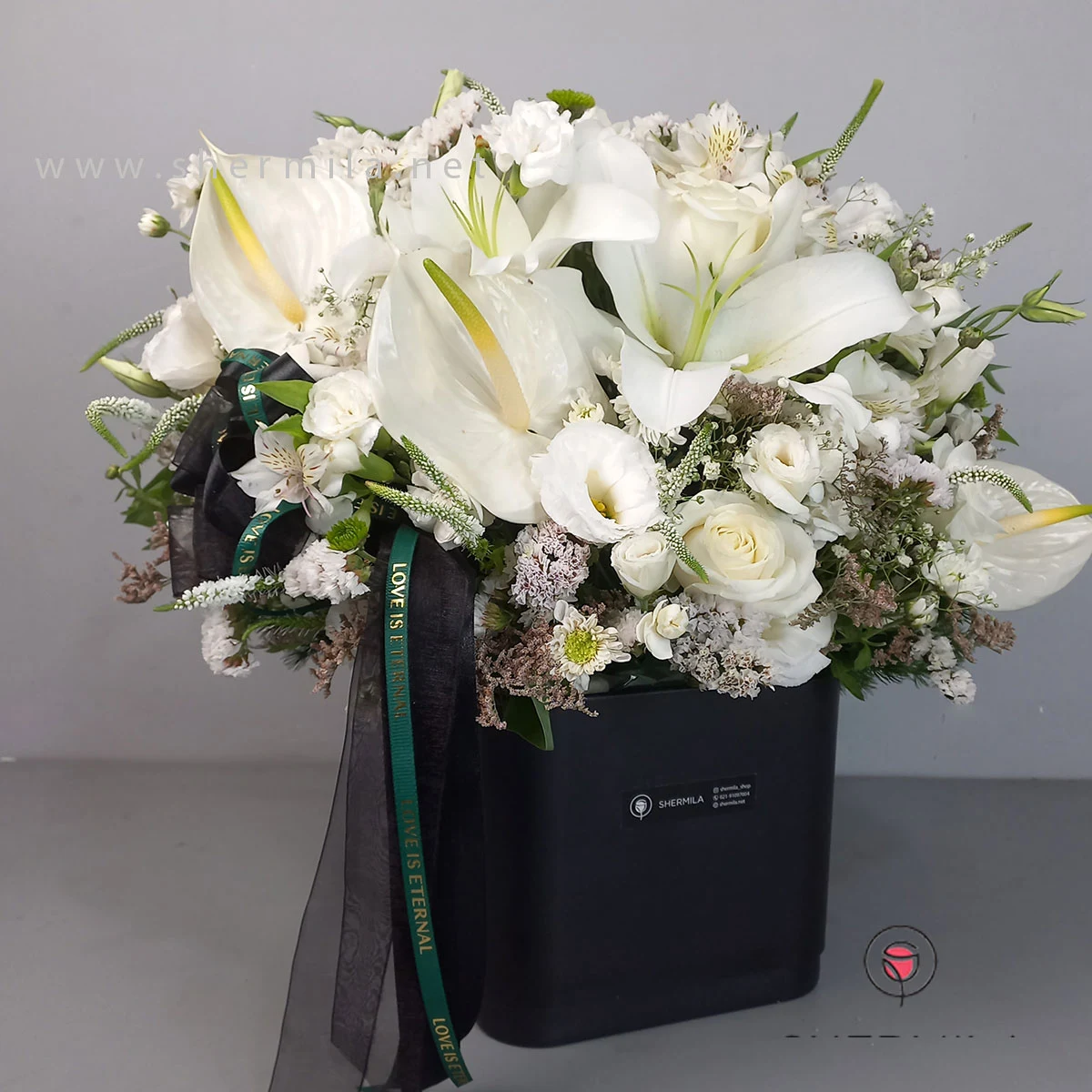این باکس گل زیبا که در تصویر می بینید،در سایت شرمیلا قابل سفارش است.این باکس شامل :