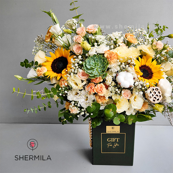 باکس گل شهیار: در این باکس گل از گلهای آفتابگردان، میخک گلبهی و سفید، لیسینتوس و آلسترومریا استفاده شده که در یک باکس مشکی رنگ با سایز کوچک قرار گرفته اند و ترکیب گل ها در کنار هم یک اثر خارق العاده و جذاب را ساخته است.