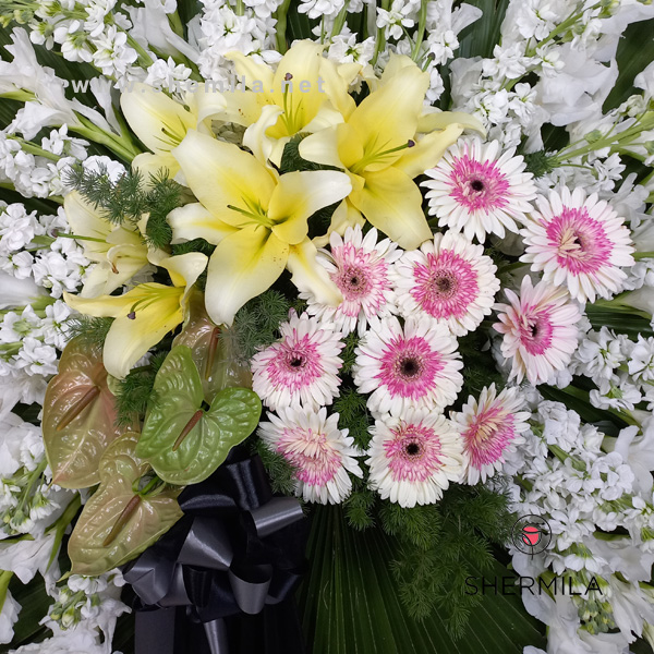 این تاج گل ترحیم زیبا که در تصویر می بینید در این صفحه قابل خریداری است. کد این محصول 3897 در سایت شرمیلا می باشد. این تاج شامل 15 شاخه شب بو ، 10 شاخه ژربرا ،7 شاخه لیلیوم نباتی،20 شاخه گلایل و 3 شاخه آنتریوم سبز می باشد که تمامی آن ها از گل خانه شرمیلا می آیند و دارای صحت و سلامت فیزیکی هستند.