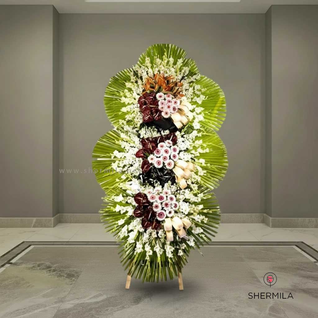 این تاج گل بسیار زیبا که در تصویر می بینید در این صفحه با کد 3712 در سایت خرید گل شرمیلا قابل سفارش است. این تاج گل بسیار زیبا شامل ۵۰ شاخه گلایل،۳۰ شاخه شب بو، ۱۵ شاخه آنتریوم سرخ ،۷ شاخه استرلیتزیا،30شاخه ژربرا و ۷ شاخه برگ پالم می باشد. تمامی این گل ها از گل خانه شرمیلا می آیند و تضمین کیفیت و صحت سلامت فیزیکی دارند.