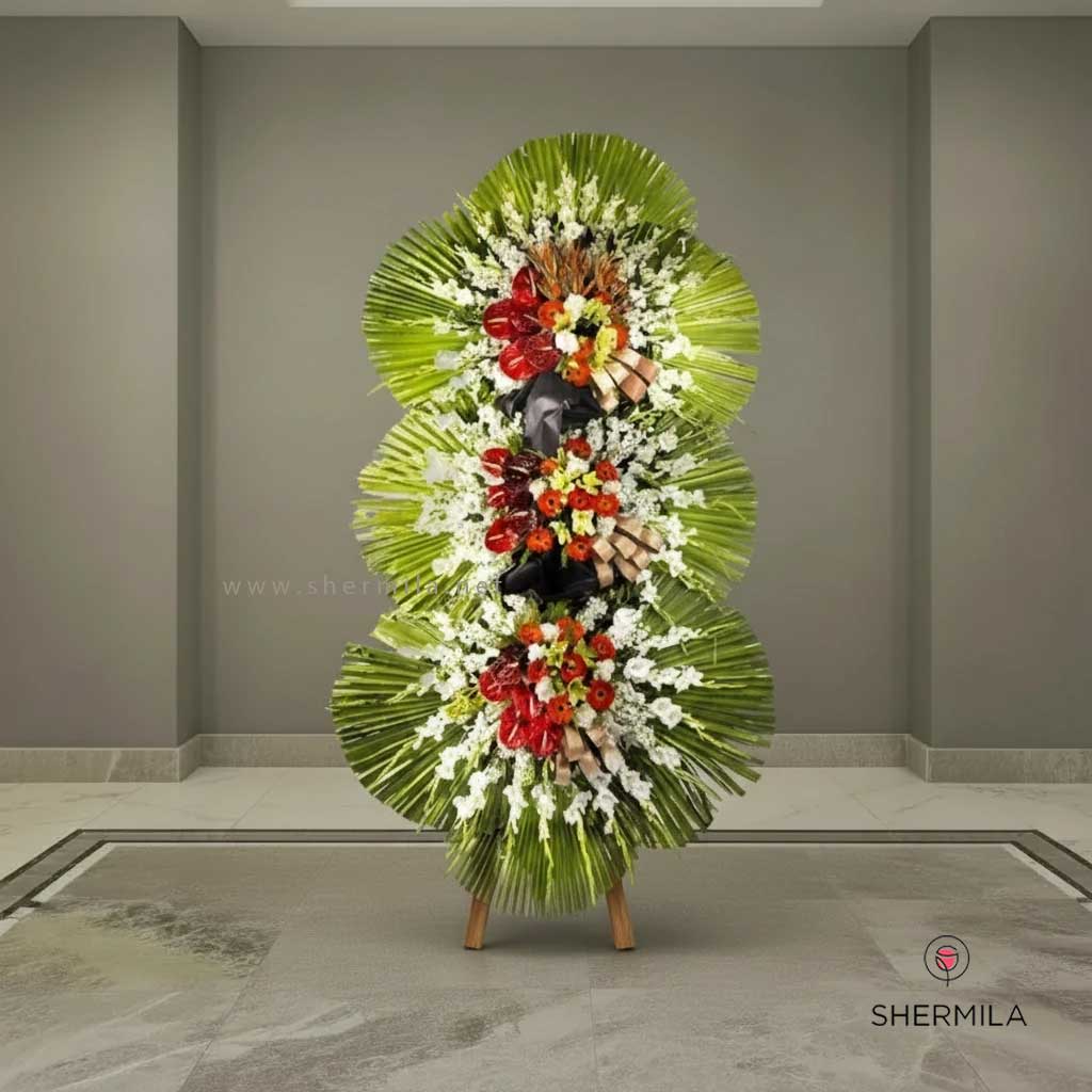 سلام به شما دوستان عزیزم، امروز با ی محصول جذاب و فوق العاده در خدمت شما هستیم تا بتوانیم لحظاتی خوش را برای شما فراهم کنیم. این محصول با کد 3710 در سایت شرمیلا قابل خریداری است. این تاج گل شامل 15 شاخه گل لیلیوم،35 شاخه شب بو،50 شاخه گلایل، 15 شاخه آنتریوم،20 شاخه ژربرا، 6 شاخه استرلیتزیا و بهمراه 6 برگ پالم است.